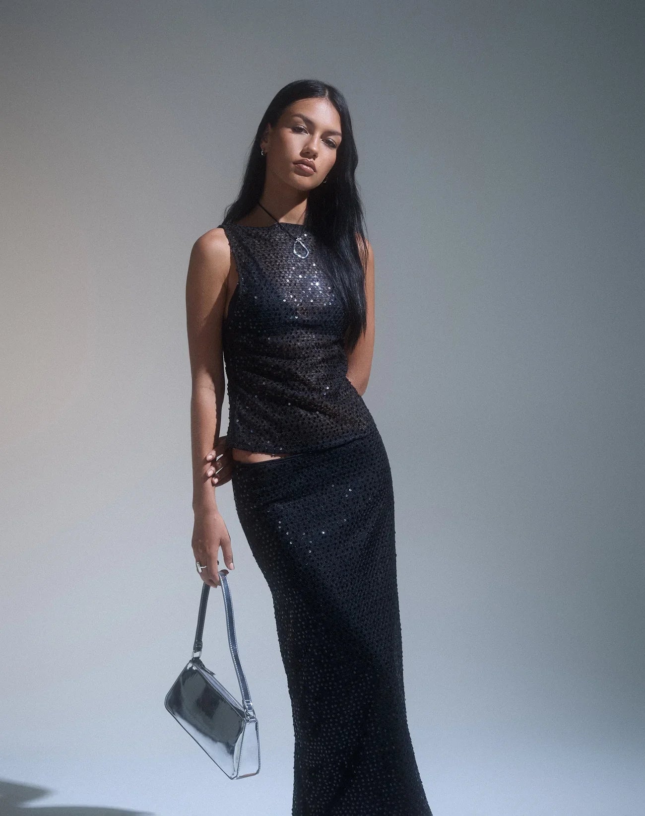 A classic cut with a touch of sparkle. This sleeveless top features a soft knit base covered in shimmering black sequins  perfect for effortless day-to-night shine.