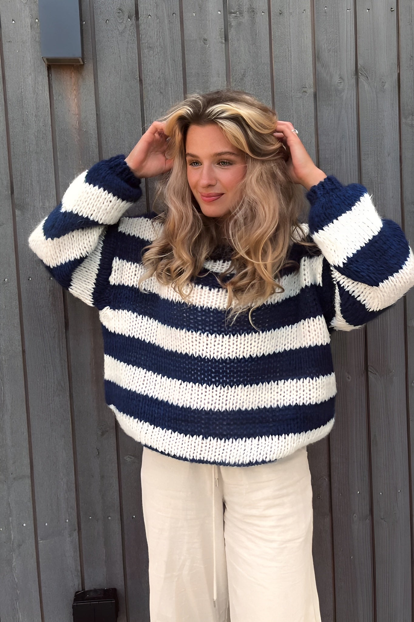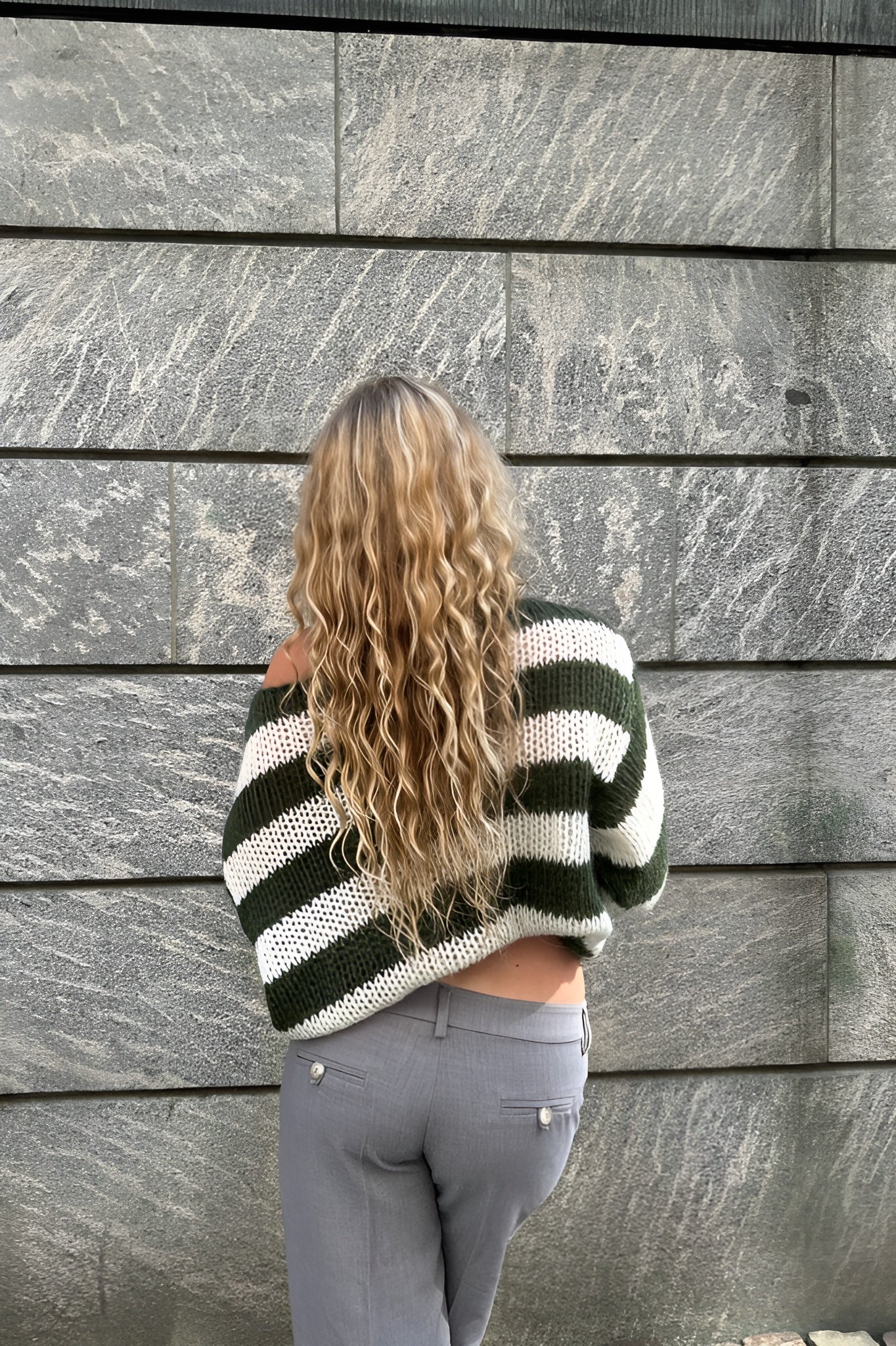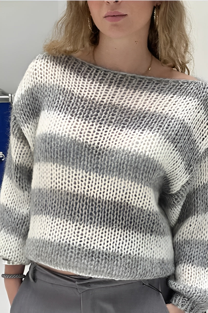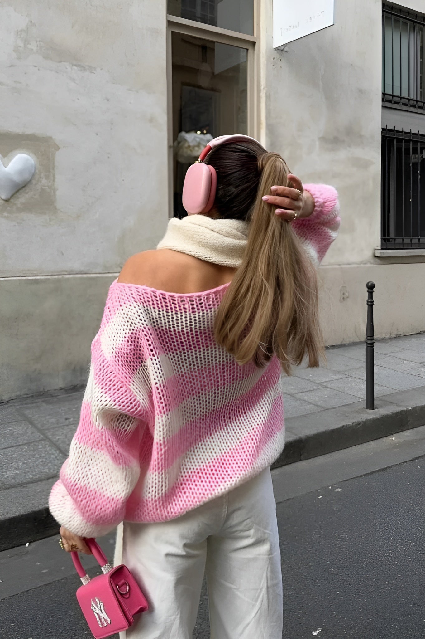 The Nova Knit Sweater brings effortless style and comfort together. With its soft knit fabric, bold stripes, and relaxed oversized fit, it's perfect for cozy days and laid-back looks.