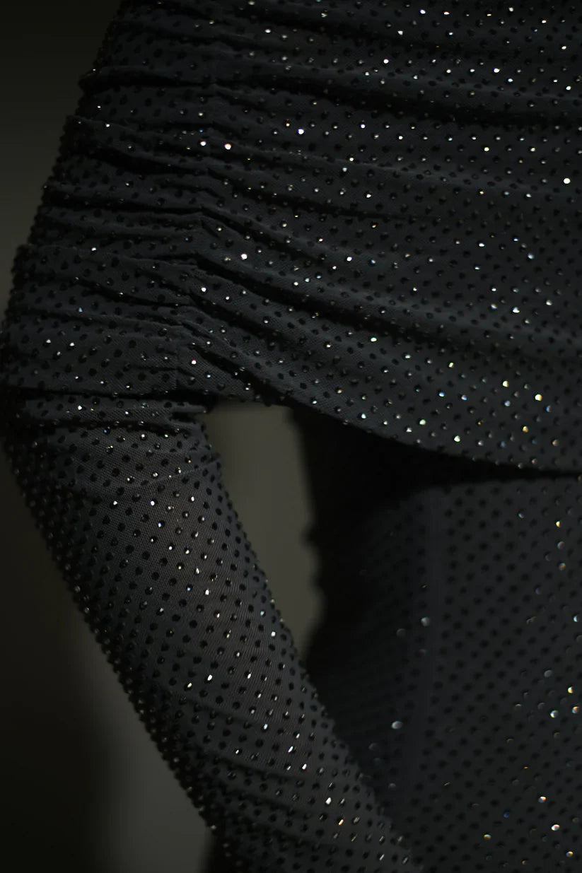 The Diamante Off-Shoulder Maxi Dress is a sleek, form-fitting maxi dress featuring a straight skirt and long sleeves. The off-shoulder neckline is elegantly enhanced by a delicate fabric overlay across the bust, while the fitted sleeves gracefully flare out at the wrists and palms. Crafted from a stretchable material for both comfort and flexibility, this dress is adorned with sparkling diamanté details for a glamorous touch.