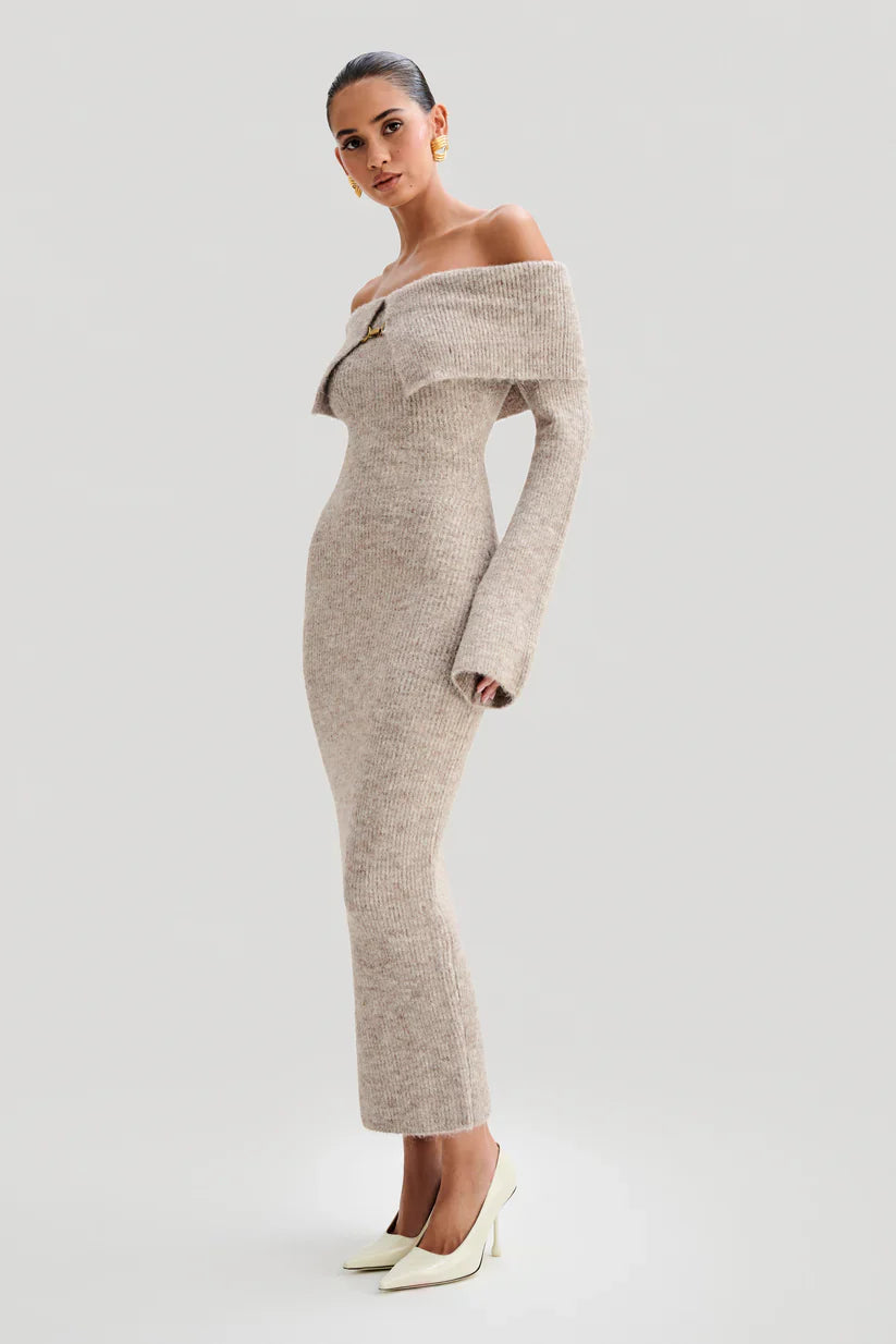Turn heads with this effortlessly chic off-shoulder midi dress, featuring a captivating Bardot neckline and soft overlay detailing, finished with eye-catching front hardware accents. The flattering bodycon silhouette, long sleeves, and midi length create a timelessly elegant shape, while the fluffy knit fabric adds a touch of texture and luxury. Perfect for evening events or upscale gatherings—just add statement heels to complete a look that radiates sophistication and allure.