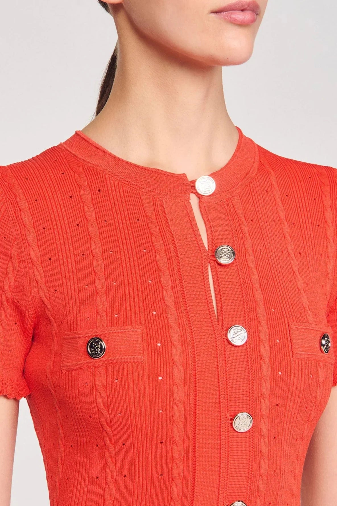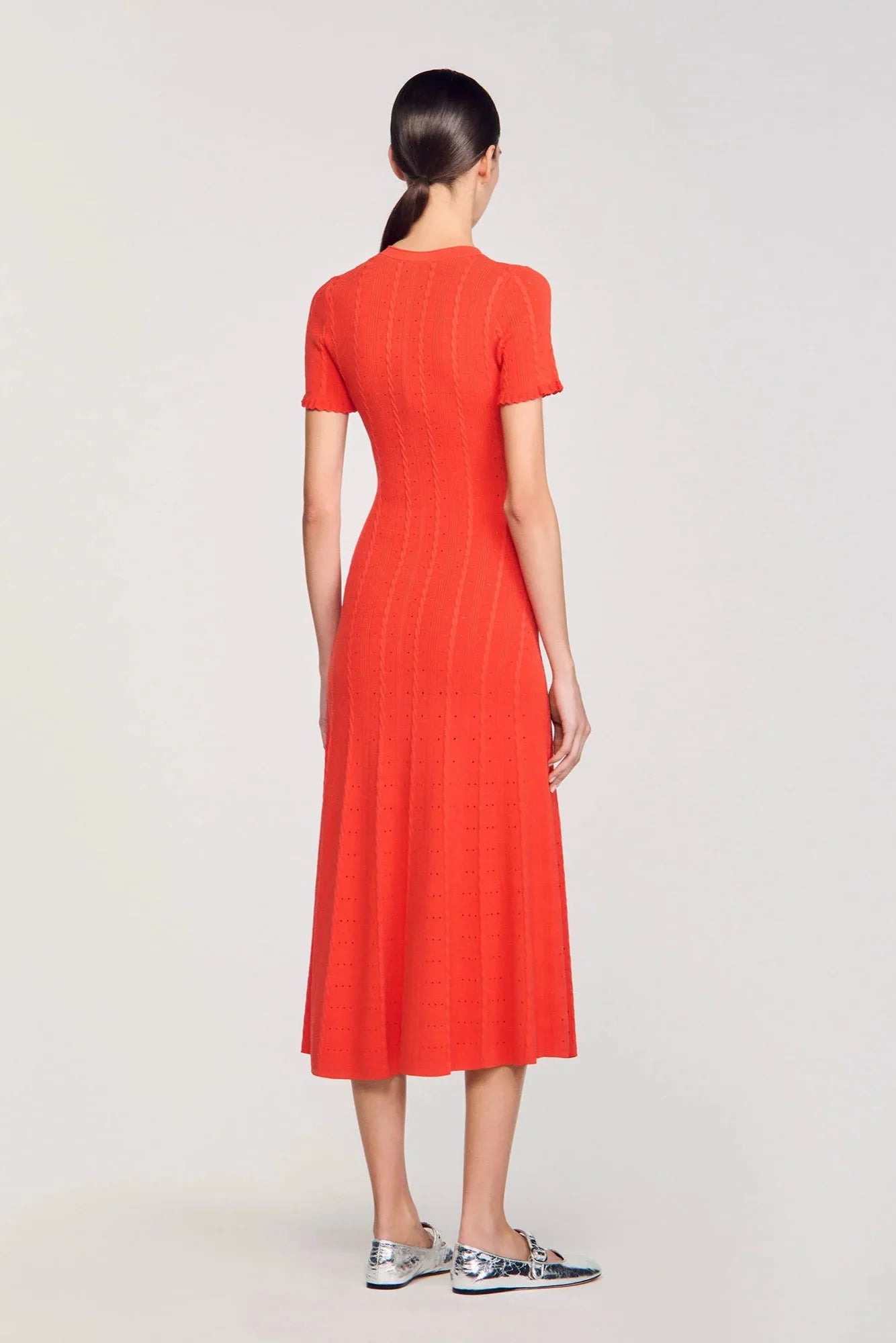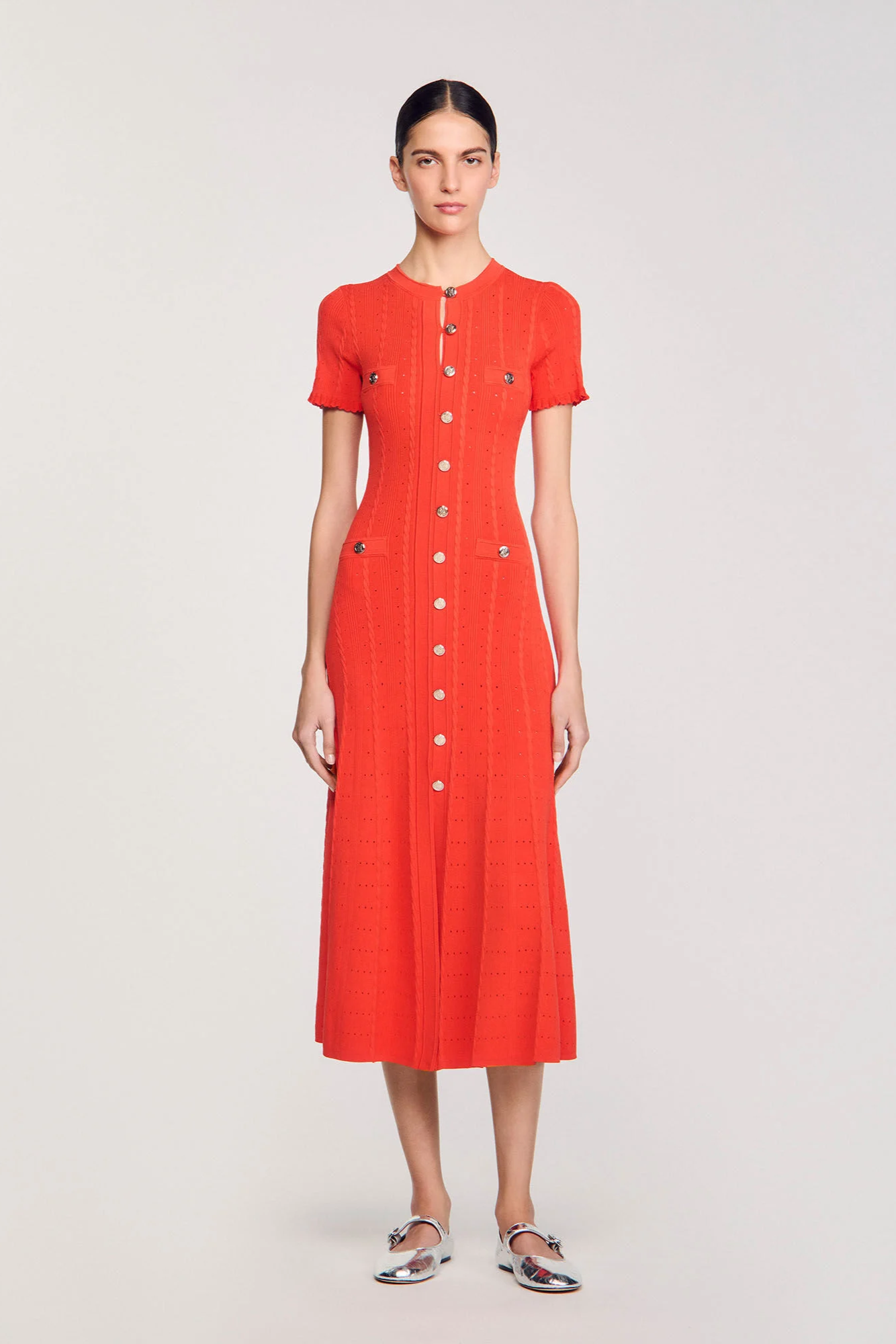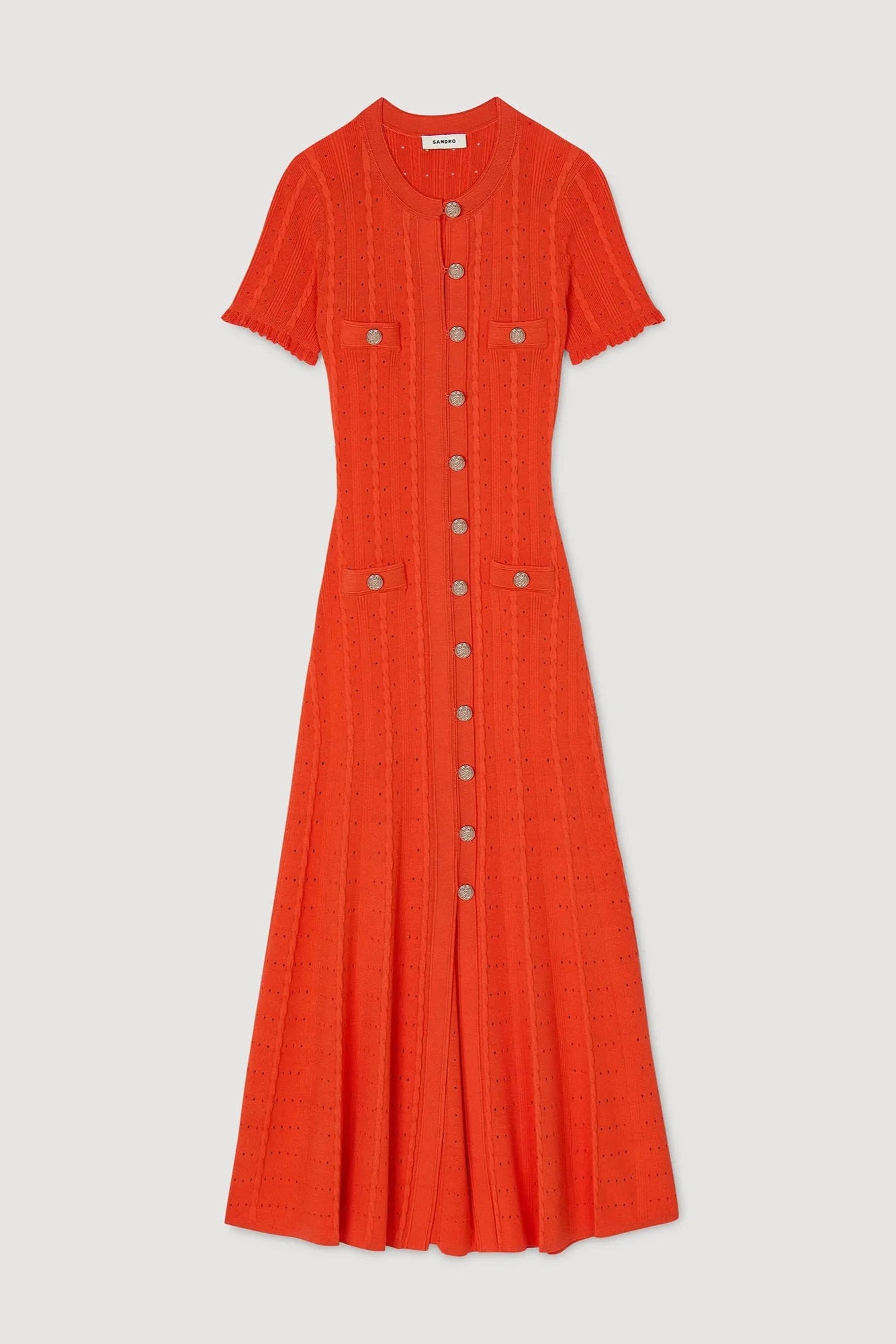 Long Knitted Dress with Decorative Stitching, Round Neckline, Button Closure, Short Sleeves, and
